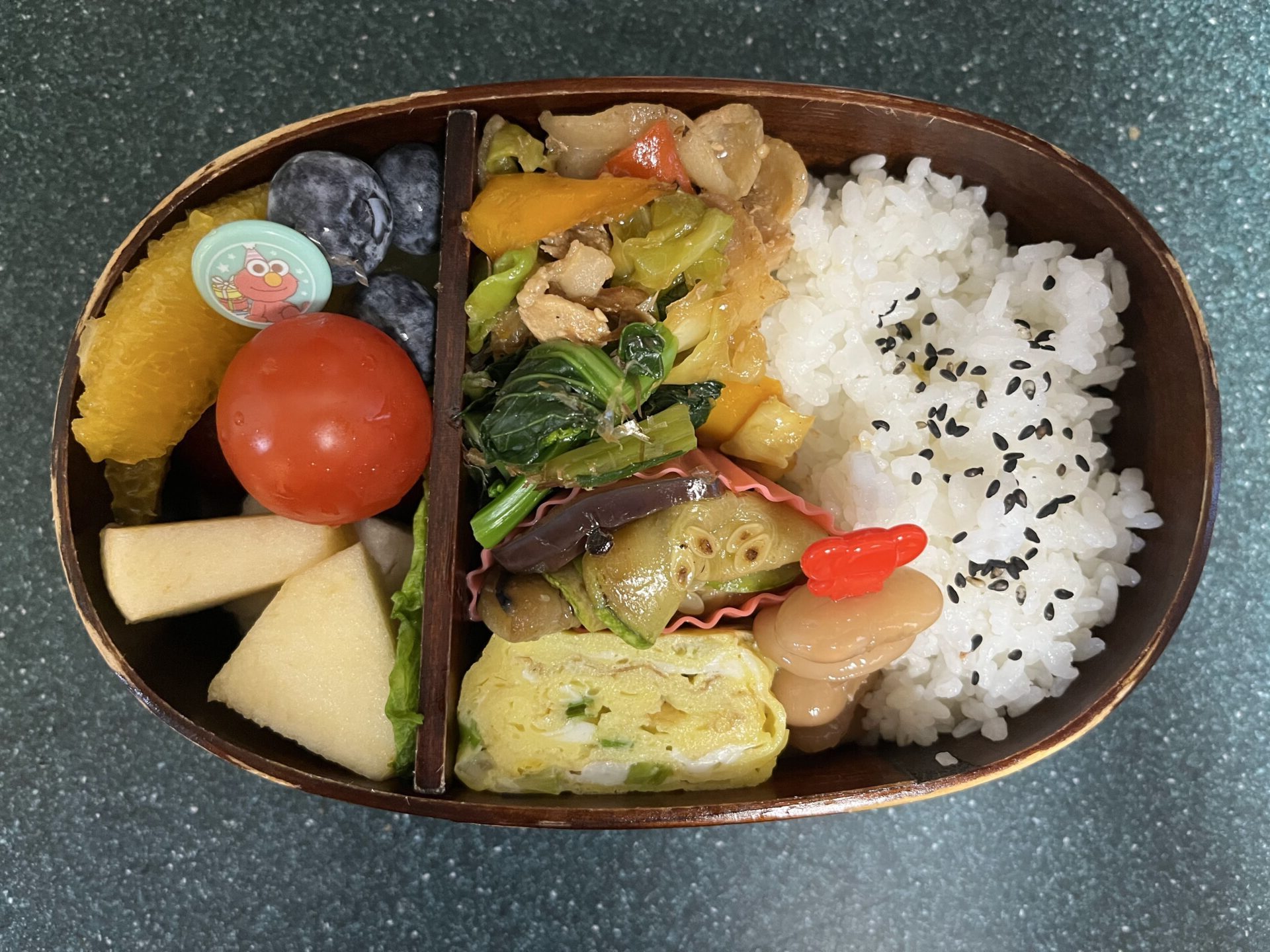 今日のお弁当は、 ⚫︎ごま塩ご飯⚫︎豚バラと野菜の味噌炒め(回鍋肉風)⚫︎ナスとズッキーニの醤油マリネ⚫︎菜心のおかか和え⚫︎白インゲン豆の甘煮⚫︎ネギ入り卵焼き⚫︎レタス、ミニトマト⚫︎アメリカンチェリー⚫︎オレンジ⚫︎りんご⚫︎梨⚫︎ブルーベリー⚫︎マスカット でした。