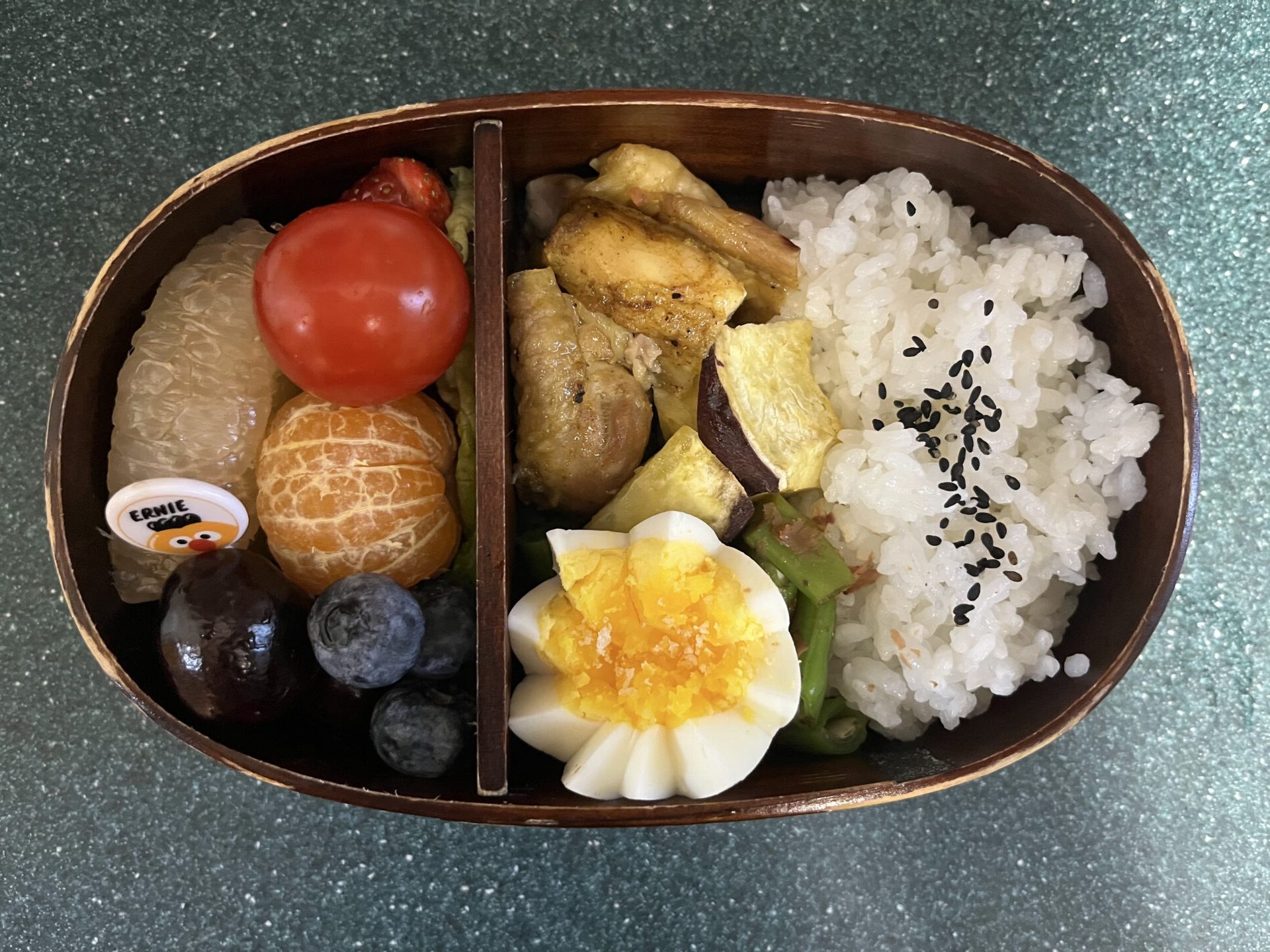 今日のお弁当は、 ⚫︎ごま塩ご飯⚫︎鶏もも肉のグリル(カレー風味)⚫︎サツマイモのグリル⚫︎インゲンのおかか和え⚫︎ゆでたまご(花形飾り切り)⚫︎レタス、ミニトマト⚫︎いちご⚫︎アメリカンチェリー⚫︎紅肉蜜柚⚫︎ブルーベリー⚫︎沙糖桔(みかん) でした。
